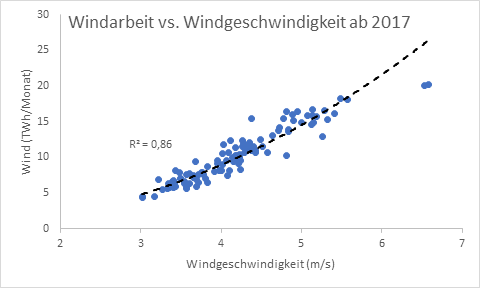 Bleiben wir zunächst bei der Windkraft. Es liegt nahe, dass die Windgeschwindigkeit hier den entscheidenden Einfluss hat. Mit Daten von „Agora“ für die monatlich produzierte Arbeit (als Multiplikation von Leistung und Zeit) und ERA5 für das monatliche Mittel der Windgeschwindigkeit ergibt sich dieses Diagramm: