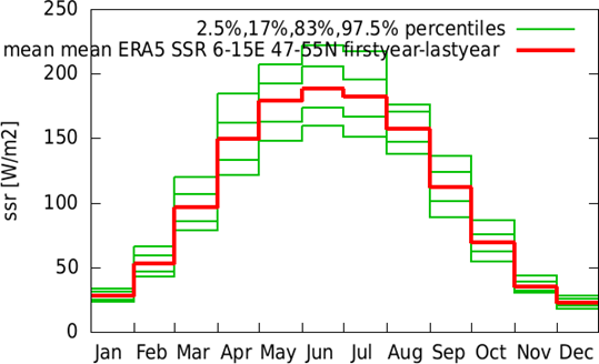 Der Jahreszyklus der Sonneneinstrahlung am Boden in Deutschland. Der dunkelste Monat ist der Dezember mit nur ca. 25 W/m², der hellste der Juni mit um 200 W/m². Auch hier wurde als Datensatz ERA5 verwendet. Die Abbildung wurde mit dem KNMI Climate Explorer generiert.