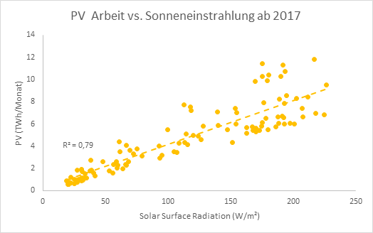 Das ist zu 79 % von der Sonnenstrahlung am Boden abhängig. Ist da vergleichsweise viel möglich (ab ca. 100W/m²) beginnt offensichtlich auch schon die Abregelung um das Stromnetz nicht instabil werden zu lassen. Mehr als 12 TWh sind noch nie erreicht worden im Monatsmittel. Das Mittel liegt auch im Hochsommer bei 8 TWh, die installierte Leistung wird nicht zu 10% ausgeschöpft. Von den dunkleren Monaten schweigen wir lieber, bei 150 W Einstrahlung sind es nur noch ca. 7%.