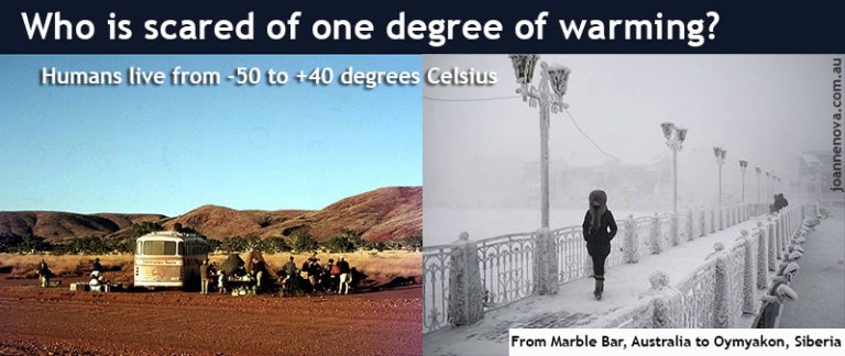 In the big scheme of human history, the world has been a lot hotter and a lot colder. Homo sapiens are 37 degree animals who retire to warm climates, not cold ones. Most people on Earth live in the warm tropics, not the cold poles. Two hundred million years of evolution mean mammals are made to deal with temperature change. We live in places that range from minus 50C minimums to plus 40C maximums (-58F to 107F). That’s a ninety degree temperature range (or 160F), and yet we’re told it’s an existential threat if the world heats by half a degree more?