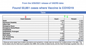 Every Friday, VAERS makes public all vaccine injury reports received to the system as of Friday of the previous week. Today’s data show that between Dec. 14, 2020, and March 26, a total of 50,861 total adverse events were reported to VAERS, including 2,249 deaths — an increase of 199 over the previous seven days — and 7,726 serious injuries, up 631 over the same time period.