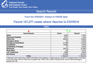 Every Friday, VAERS makes public all vaccine injury reports received as of a specified date, usually about a week prior to the release date. Today’s data show that between Dec. 14, 2020 and April 30, a total of 157,277 total adverse events were reported to VAERS, including 3,837 deaths — an increase of 293 over the previous week — and 16,014 serious injuries, up 2,467 since last week.