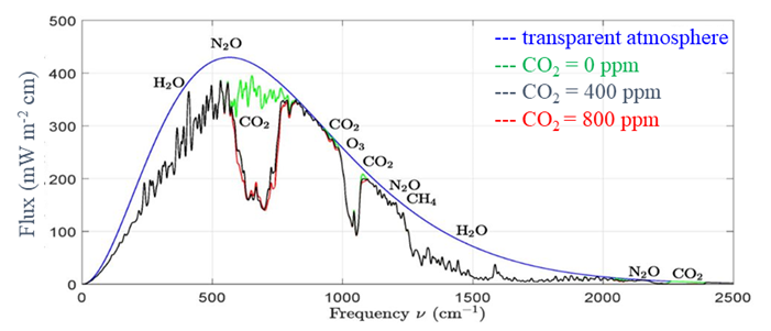 The video recognizes the importance of saturation which has been studied by a number of scientists3,4. The figure below shows that doubling the CO2 concentration from 400 to 800 ppm, makes a small difference in the top of the atmosphere flux of infrared radiation to space. Integrating over all frequencies yields a forcing of 3 W/m2 which is only about 1% of the average infrared radiation to space. The effect due to doubling CO2 is smaller than suggested by the cartoon used in the video.