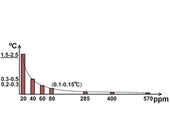 Trenutna koncentracija CO2 u atmosferi je oko 400 ppm. Iz grafikona je vidljivo da daljnje dodavanje većih količina ugljikovog dioksida dodaje vrlo malo topline izražene preko globalne temperature.