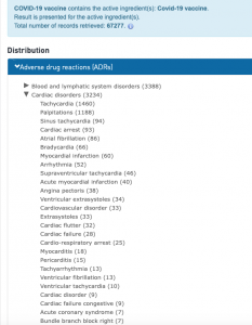 The World Health Organization’s (WHO) vaccine injury reporting system, “Vigiaccess” has recorded 3,234 reports relating to cardiac disorders. Vigiaccess is a database of reactions of reports from 142 countries, but so far the 67,277 COVID 19 reports are mostly from Europe (81%), the U.S. (19%) and Asia (1%). It is unclear if there is duplication with VAERS and Yellow Card system.